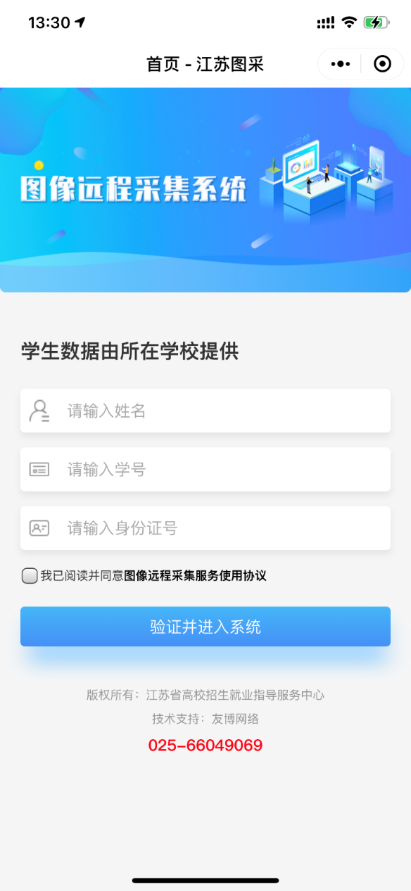 本次图像采集为线上采集,请同学们登录微信,搜索小程序“江苏图采”,或关注“江苏省招就中心” 公众号,点击“服务指南”中的“图像采集”项目,实名验证通过后,严格按系统要求进行在线采集和校对确认。