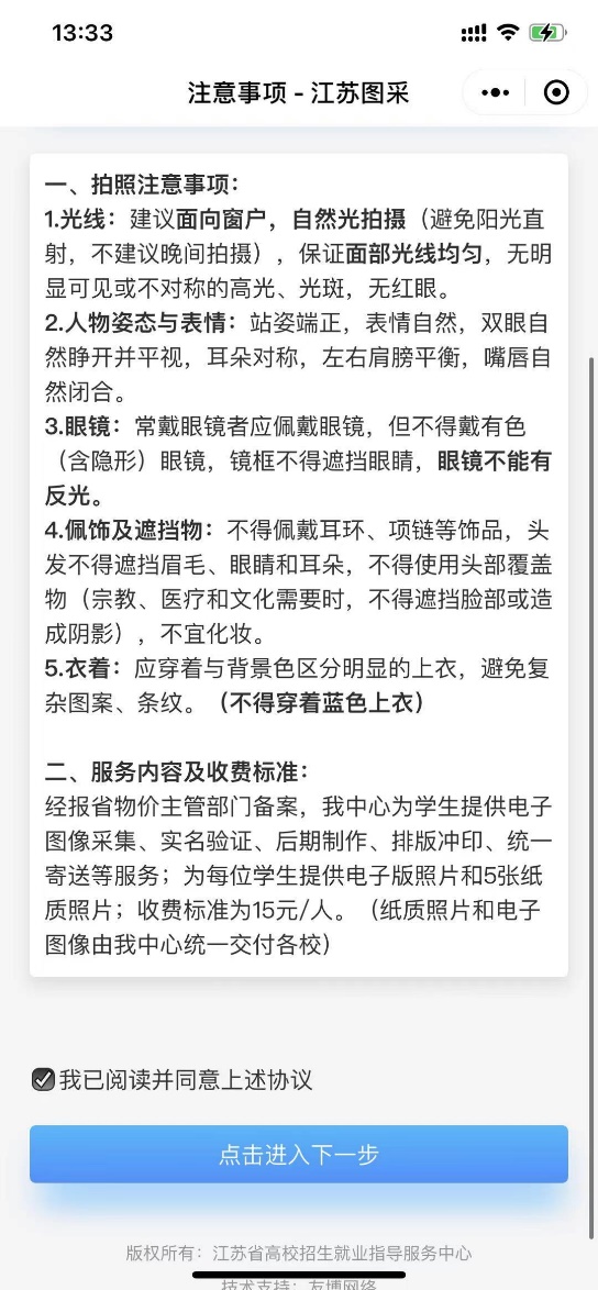 经报省物价主管部门备案,省招就中心将为员工提供电子图像采集、实名验证、后期制作、排版冲印、统一寄送等服务;为每位员工提供电子版照片和5张纸质照片;收费标准为15元/人(纸质照片和电子图像由省招就中心统一交付学校),在线提交照片时完成交费。