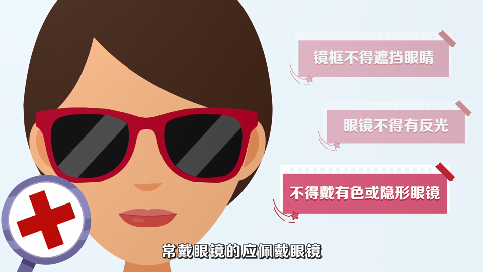 3.眼镜:常戴眼镜者应佩戴眼镜,但不得戴有色(含隐形)眼镜,镜框不得遮挡眼睛,眼镜不能有反光。