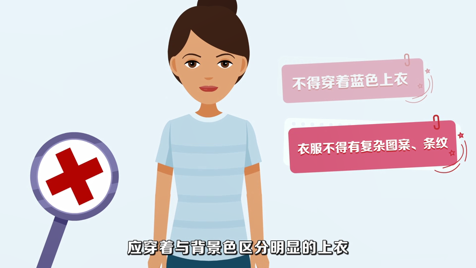 5.衣着:应穿着与背景色区分明显的上衣,避免复杂图案、条纹。(不得穿着蓝色上衣)