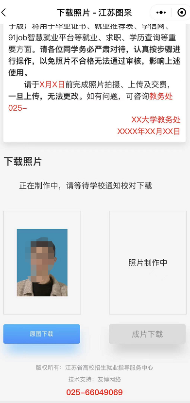 重要提示:本次采集的电子图像将作为学历证书的重要内容在教育部平台进行电子注册。照片(纸质版、电子版)将用于毕业证书、就业推荐表、学信网、91job智慧就业平台等就业、求职、学历查询等重要方面。请各位同学务必严肃对待,认真按步骤进行操作,严禁翻拍,以免照片不合格无法通过审核,影响上述使用。采集过程中,如有实际困难或遇到问题,可联系教务处刘老师,电话:0513-85012069。